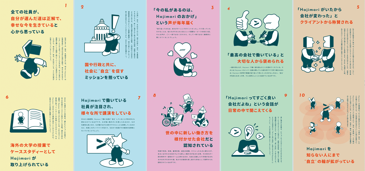 そして将来、このBHAGを達成したときに見える世界、「10Views」も掲げています。10年後に自分たちがどういう世界を作りたいのか、その中でHajimariがどのような役割を担っていくのか、それを言語化、ビジュアル化しました。こちらを示したことで、「自立」という抽象度の高い言葉に輪郭が生まれ、確かなイメージを持って社員、お客様、取引先様に共有できるようになりました。